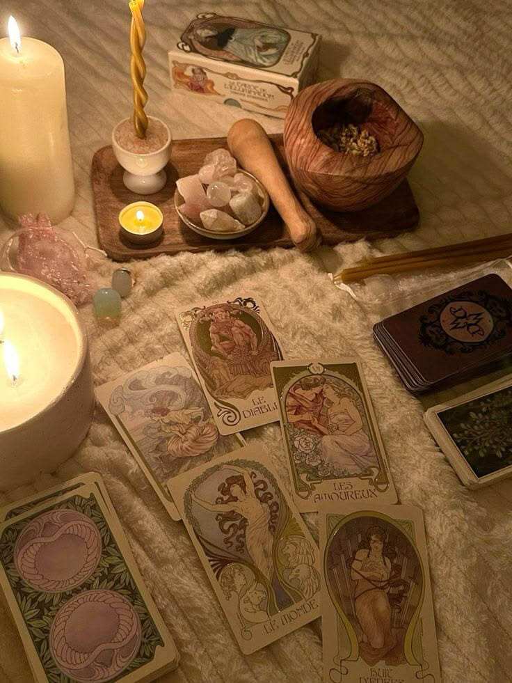 Esta tradición viene de aún más atrás: mi bisabuela ya leía las cartas, siempre con una taza de manzanilla fresca de su jardín entre las manos. Aunque yo no la conocí, mi madre aprendió de ella desde pequeña, absorbiendo cada palabra, Así la magia de las cartas llegó hasta mí.